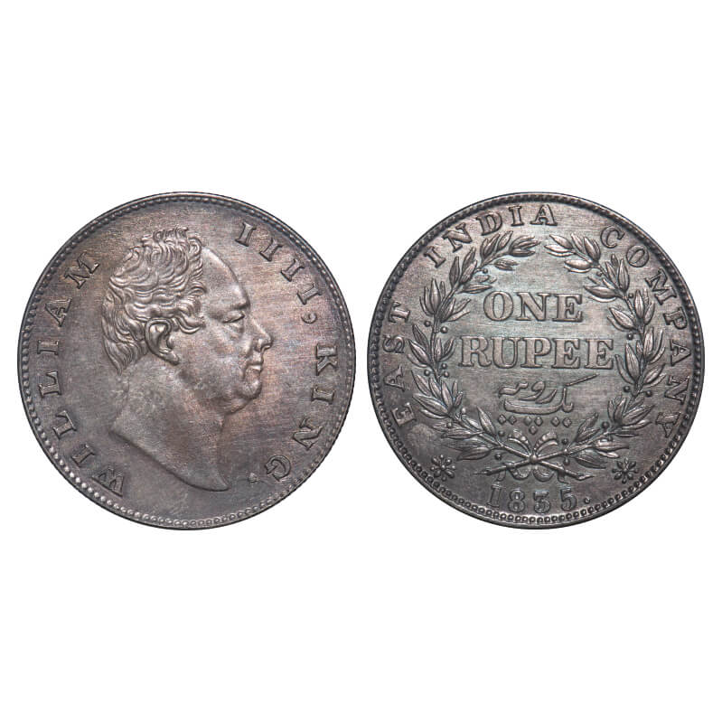 William IV, Silver, Rupee, 1835, Calcutta Mint, B/II(ii), R.S. incused, Medium thin size letters of the legend, Leaf tip in the wreath falls short of base of 'T' in East, With bud leaves above 'E' of One, Wreath with 20 Berries (11L + 9R). F. Prid 32. GK 4. Uncirculated, Toned. Rare.