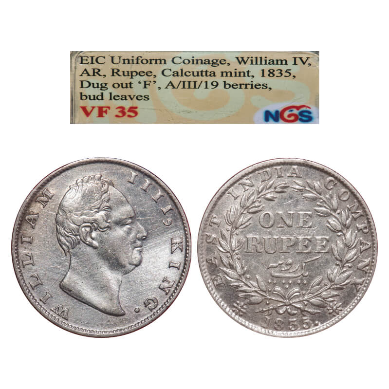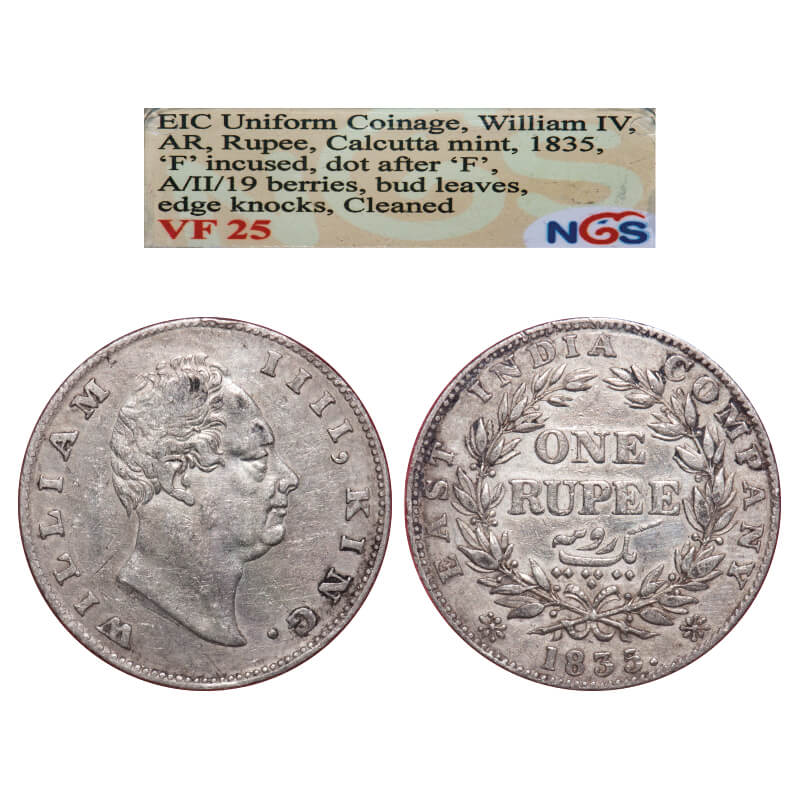 William IV, Silver, Rupee, 1835, Calcutta Mint, A/II, F. incused, Dot after F, With a raised dot after year, Large and thick sized letters of the legend, Leaf tip in the wreath falls short of base of 'T' in East, With bud leaves above 'E' of One, Wreath with 19 Berries (10L + 9R). F. Prid. Unlisted. GK 8. NGS Slabbed VF 25. Very Scarce.