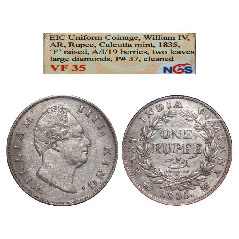 William IV, Silver, Rupee, 1835, Calcutta Mint, A/II, 'F' raised, Rev aligned, Large and thick letters of the legend, With Two leaves above 'E' of One, Wreath with 19 Berries (10L + 9R). F. Prid 37. GK 30. NGS Slabbed VF 35. Very Scarce3.