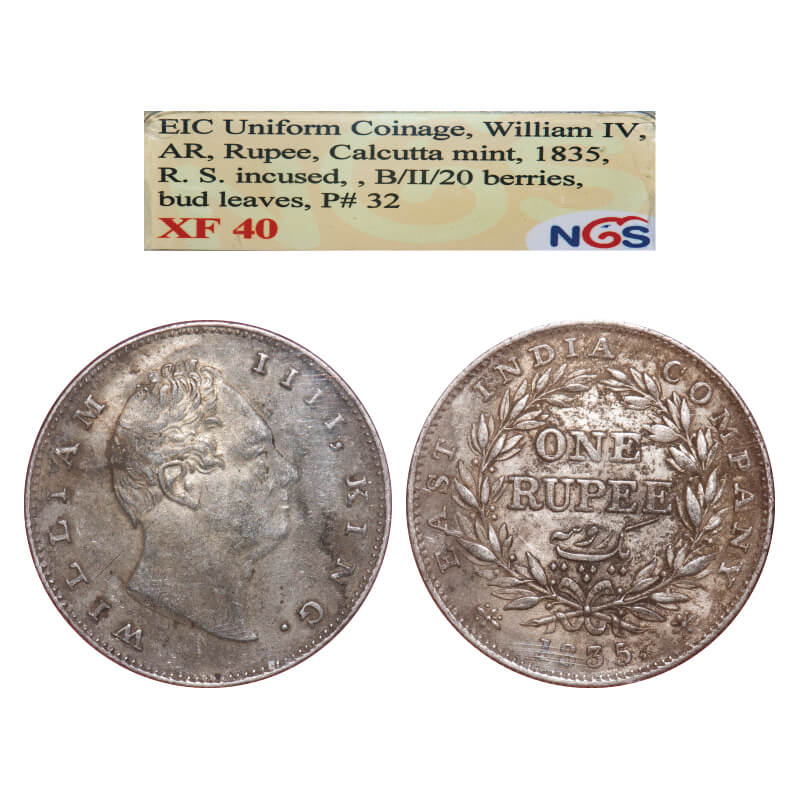William IV, Silver, Rupee, 1835, Calcutta Mint, B/II(ii), R. S. incused, Medium thin size letters of the legend, With bud leaves above 'E' of One, Wreath with 20 Berries (11L + 9R), The leaf tip in the wreath falls short of base of 'T' in East. F. Prid 32. GK 4. NGS Slabbed XF 40. Very Scarce.