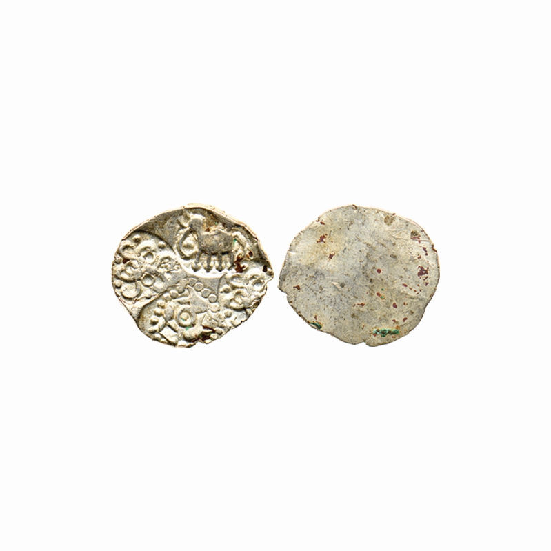 Punch Marked, Vidarbha Janapada, Paratwada (Vidarbha) Region, Silver ¼ Vimashatika, 1.30gm, ABCC type, Four symbol type, Obv: Elephant on top and twice symbol of four fish moving beside the circle, Rev: Traces of original symbol.