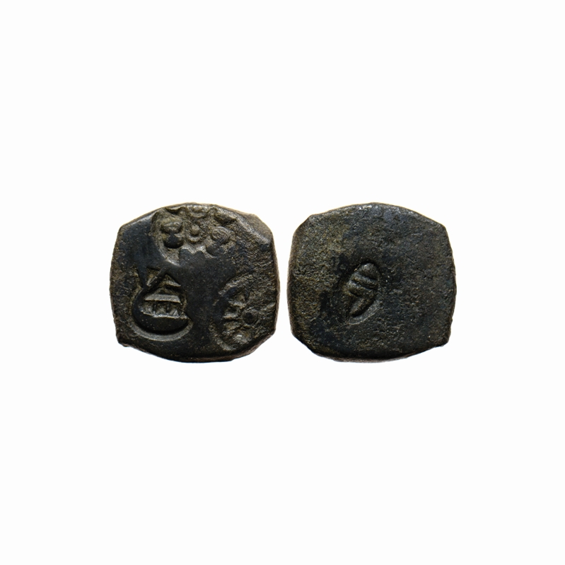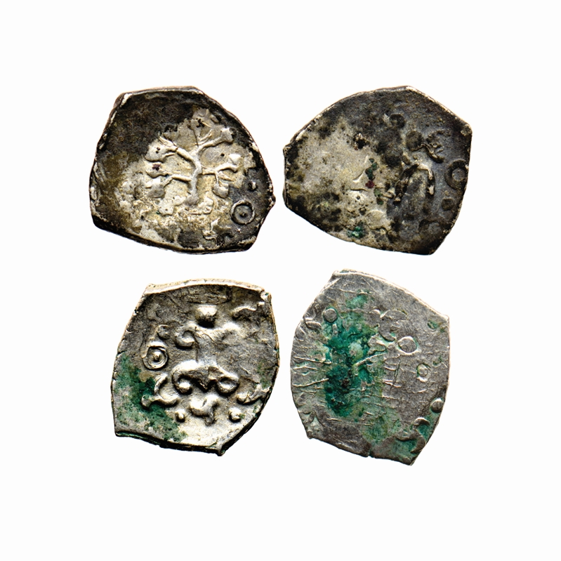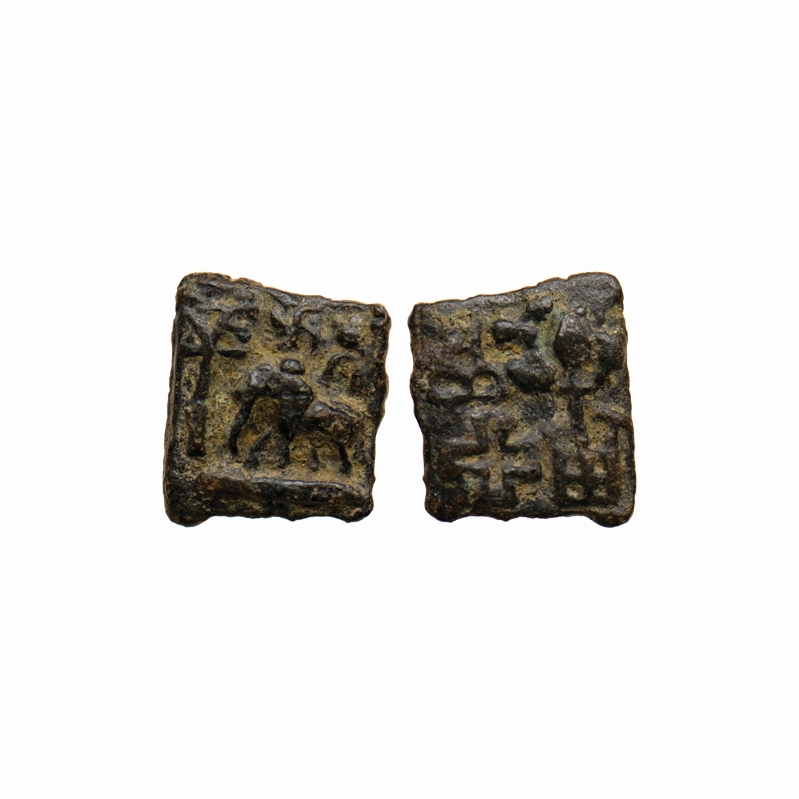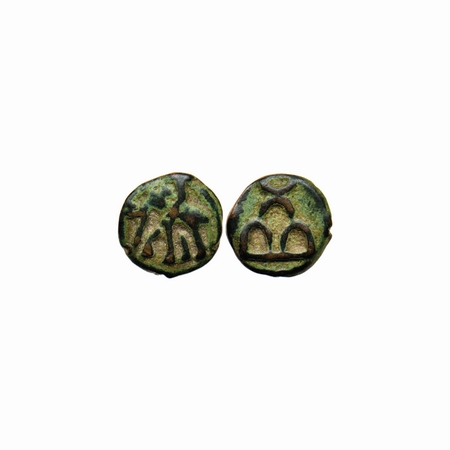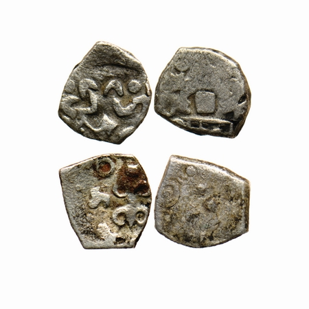 Punch Marked, Post-Mauryun, Vidisha Region, Copper Karshapana (4 Coins), Various symbol including Sun, three arched hill, human figure and geometric symbol on obv, Banker mark on rev. Mitch ACW # 4328.