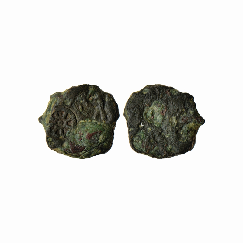 Punch Marked, Vanga Janapada, Chandraketugarh Region, Copper Base Alloy, 2.05gm, Obv: Wheel and like a boat symbol, Rev: Uniface. Rajgor Series # 4.