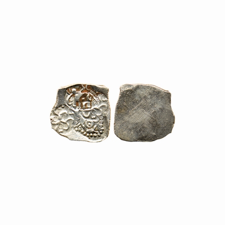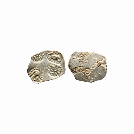 Punch Marked, Surashtra Janapada, Silver (2 Coins) Mashaka, 0.86gm/0.72gm, Srivatsa with beside circkle and trisckle, on second geometric symbol on obv., Traces of main symbol on rev. Rajgor Series # 19.