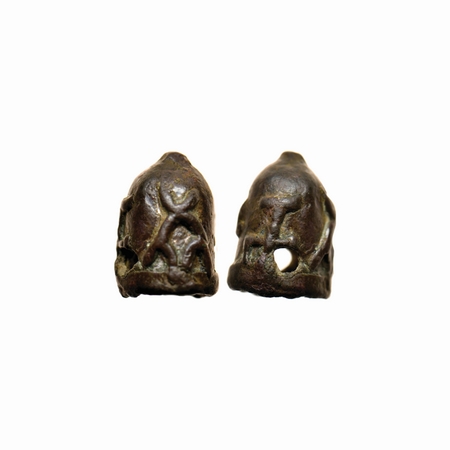 Primitive Money, Vidisha Region, Copper, 7.16gm, shaped like a thimble or tower. Three arched hill with crescent and other symbol, two holes at the opposite ends. Probably an ornament. Bopearachchi & Piepeer, Pg 174.