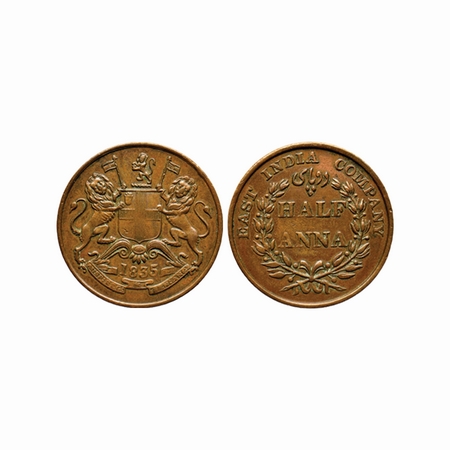 William IV, EIC, Copper, Quarter Anna, 1857, R.Heaton & Sons Mint (London). Wreath tips with single leaf. F. Prid 151.