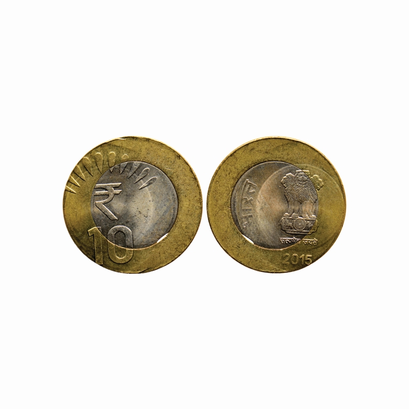 10 Rupee, 2015, 7.80gm, Bimetal Nickle - Bronze, Error, struck off centre on both the sides, Calcutta Mint.