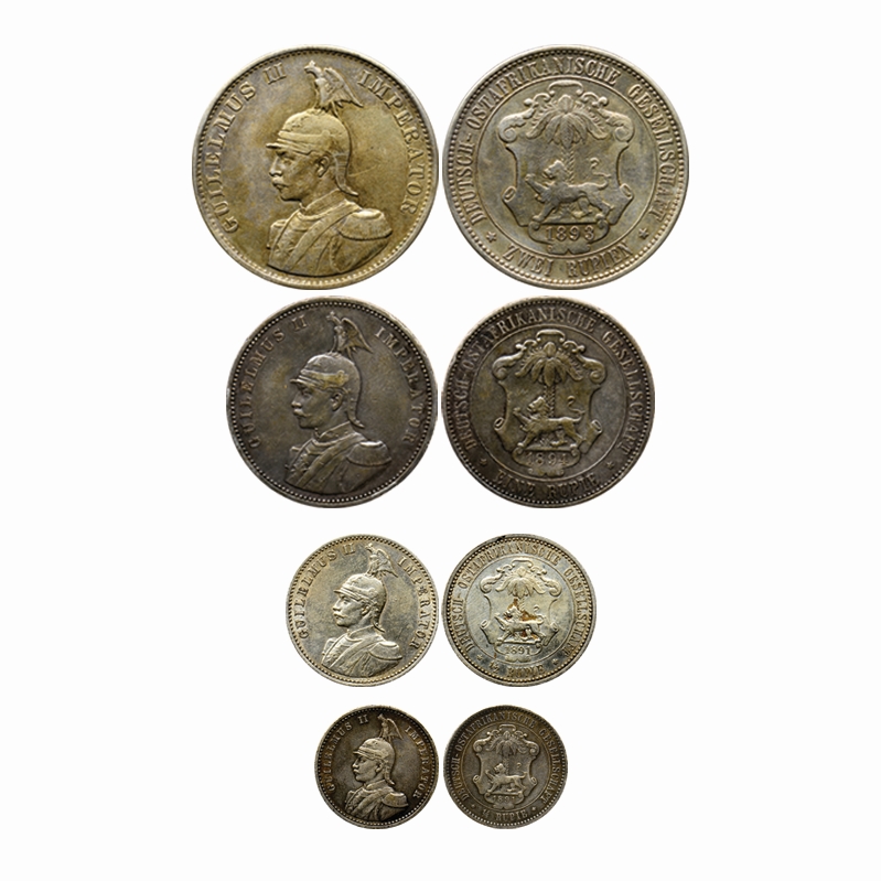 German East Africa, Silver set of 4 coins, Wihelm II, 2 Rupien 1893, 1 Rupien 1894, 1/2 Rupie 1891, 1/4 Rupie 1891, KM 5, 2, 4, 3.