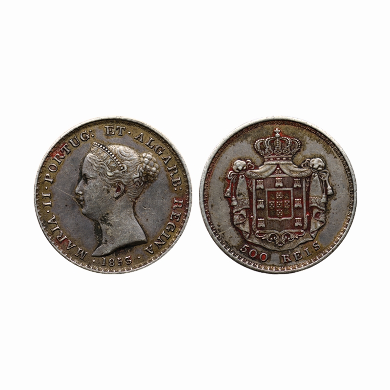 Portugal, Silver 500 Reis, 14.75 gm (0.917 silver), 1853, Obv: Portrait of queen, head left and date, Rev: Coat of arms and denomination. KM 471.