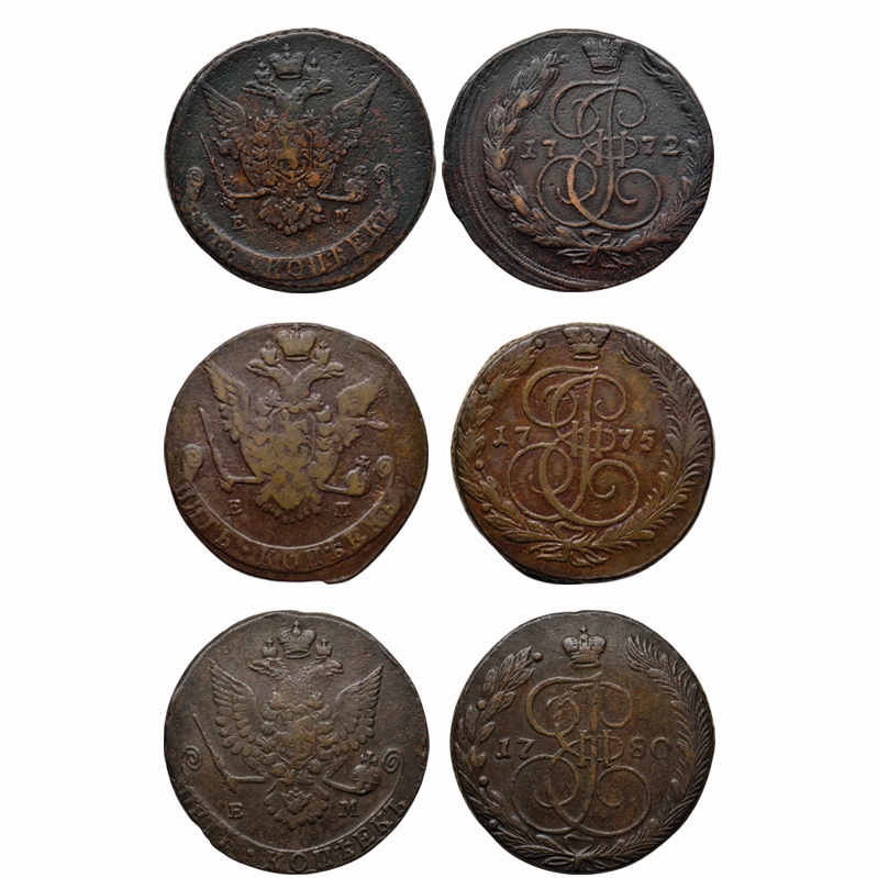 Russia, Copper 5 Kopeks (3 Coins), 1772, 1775, 1780 AD (EM), Catherine II, Obv: date and initials below crown , Rev: Crest. C# 59.3.