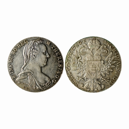 Austria, Silver Thaler, 28.03gm (0.8330 silver), 1780 AD, Restrike Trade coinage, Gunzberg Mint, SF (Mint master Tobias Schobl & Ward J. Faby) Ruler Maria Theresa, Obv: Veiled bust right, M.THERESIA.DGR. IMP.GE.HU.BO.REG.Rev: Crowned arms BURG.CO.TYR 178