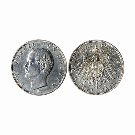 German States-Bavaria, Silver 3 Mark, 27.60gm (0.900 silver), 1913 AD (D), Obv: Bust pf Otto to left , Rev: Crest, date and denomination. KM 996.