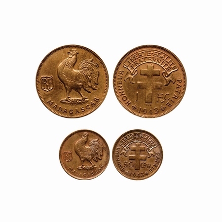 Madagascar, Bronze Franc & 50 Centimes (2 Coins), 1943 AD (SA / Pretoria Mint), Obv: Rooster to leftt , Rev: Cross of Lorraine, date and denomination.KM 1 & 2.