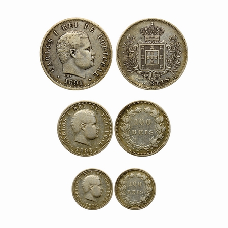 Portugal, Silver Set of 3 Coins (0.917 silver), 500 Reis/ 1891, 200 Reis/ 1891, 100 Reis/1893, Carlos I, Obv: Portrait of King, head Right and date, Rev: Coat of arms and denomination. KM 535, 534, 531.