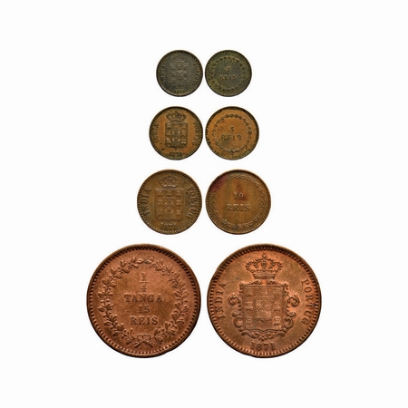 Indo Pourtuguese, Copper (4 Coins), D. Luis (1861-1889 AD), 3, 5, 10 Reis & ¼ Tanga, 1871 AD, Goa issue, Coat of arms and date on obverse, denomination on reverse, A.Gomes (page 601, 602) 03.01, 04.01, 05.01, 06.01 / KM 301, 302, 303, 304.