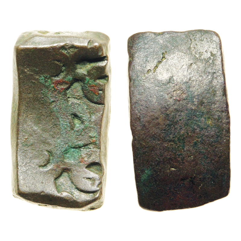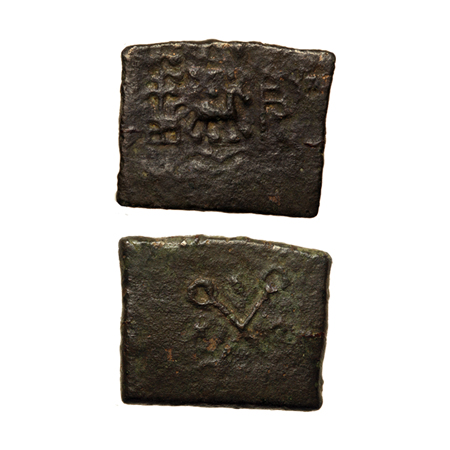 Post - Mauryan, Punch Marked type, Narayanmitra (200 BC), Narmada Vally, Punch Marked type, Copper Karshapana, 5.53gm, Obv: Railing Indradhvaja in centre, taurine, and on top Brahmi legend 'rajno narayanamitasa', Uniface.
