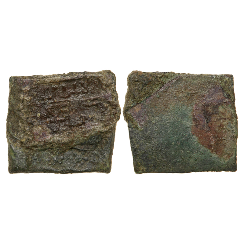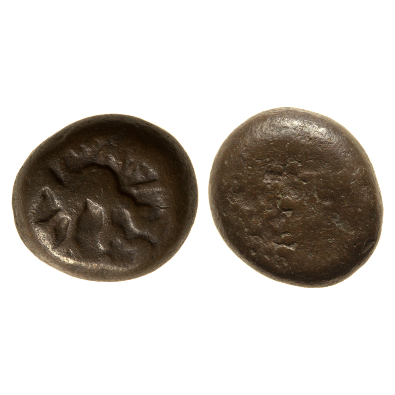 City State Issue, Mughmuke, (c. 200 BC), Lead Unit, 5.12gm, Obv: Frog under scale, Rev: human figure standing holding arms and traces of legend.