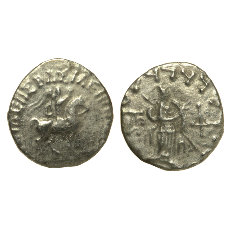 Indo-Scythians, Azes I, Silver Drachm, 1.55gm, Obv: King mounted on a horse to right holding a whip, Rev: Pallas Athena holding a bow and arrow.
