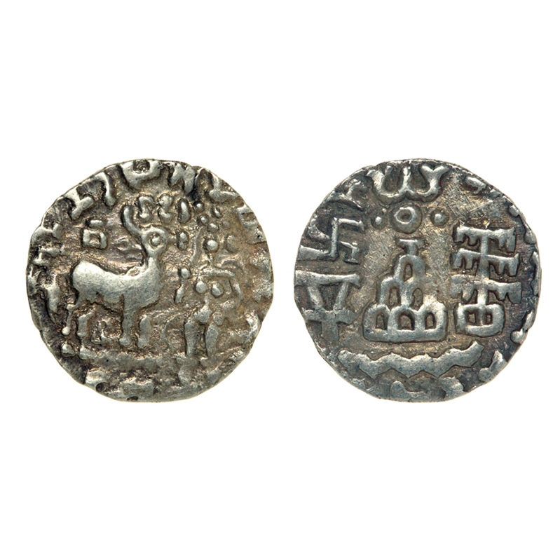 Kunindas, Amoghabhuti (c. 200 BC), Silver Drachma, 2.09g, Obv: Deer standing to right with a six arched hill between its legs, goddess holding a flower surrounded by Brahmi legend mentioning 'Maharaja Amoghabhutisa' of the Kuninda tribe, Rev: Stupa, Swast