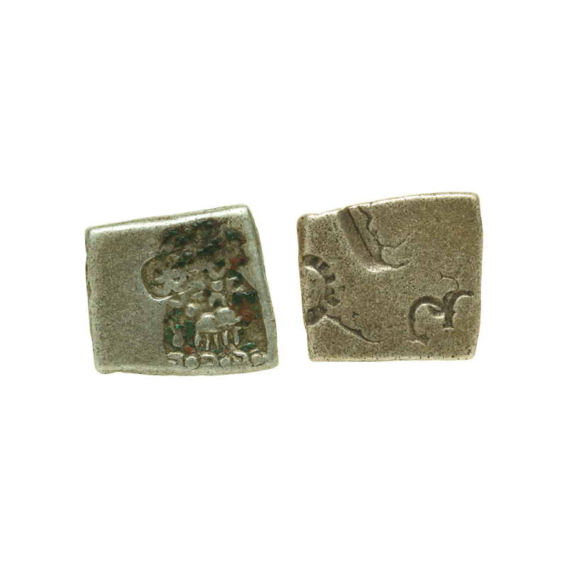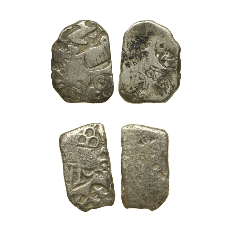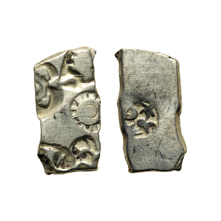 Punch Marked Coinage, Mauryan Dynasty (300 BC), Silver Karshapana (2), Obv: Sun, six armed, elephant, deer, three arched hill and other symbols, Rev: bankers mark.