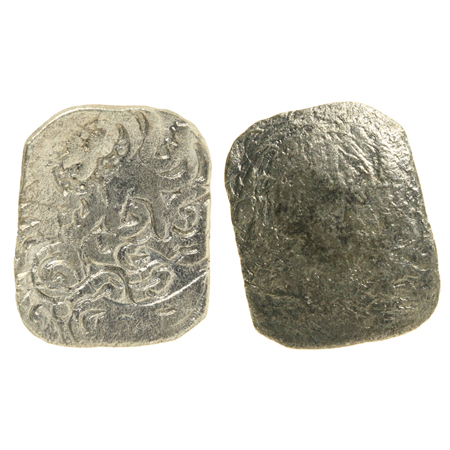 Punch Marked Coinage, Early Kashi type, Silver Karshapana, 4gm, Obv: Geomatrical symbol and taurine as a bankers mark, Uniface. Terry Hardaker # ONS 220.
