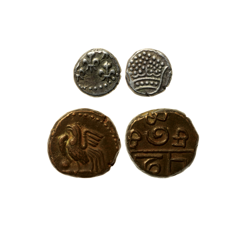 Indo French, (2), Pondichery Mint, Silver Half Fanon 0.74gm, Copper Doudou 4.15gm. KM 39 & 52.