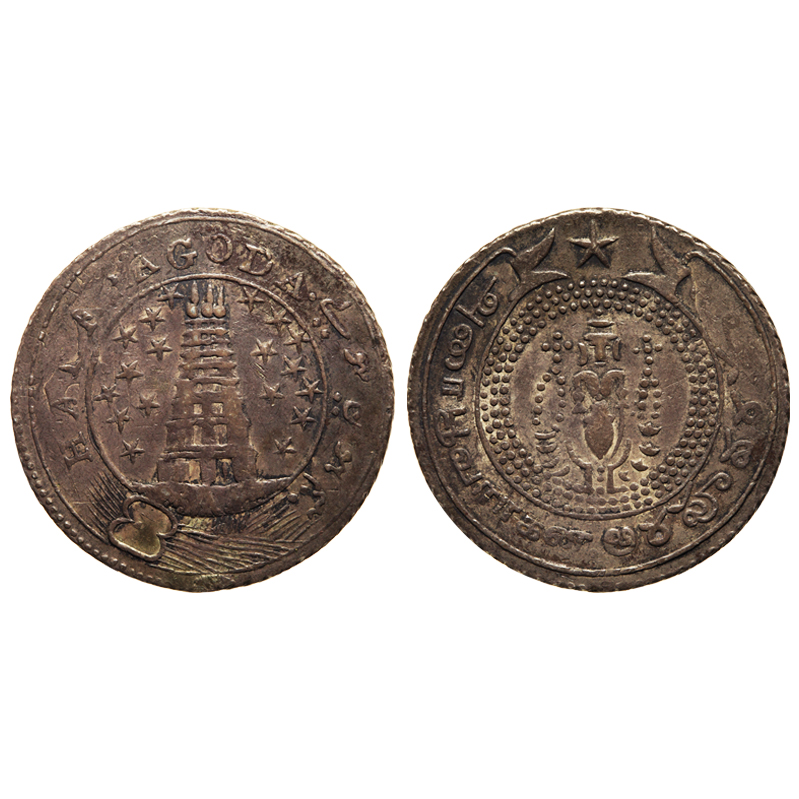 Madras Presidency, Silver Half Pagoda, 20.98gm, 1808 AD (Second Issue). Clearly seen that the coin is struck on Spanish Riyal. Obv: Gopuram of a temple with stars either sides. On a ribbon, the ends seperated by a buckle the value in. English Legend HALF PAGODA, Persian NIM HUN PHULI. Rev: The deity Vishnu surrounded by dotted circles. The value around in. Tamil legends ARAI PU VARA KUN. Teugu Legends ARA PU VARA HUN on a ribbon saperated with star. Edge grained. PR 169.