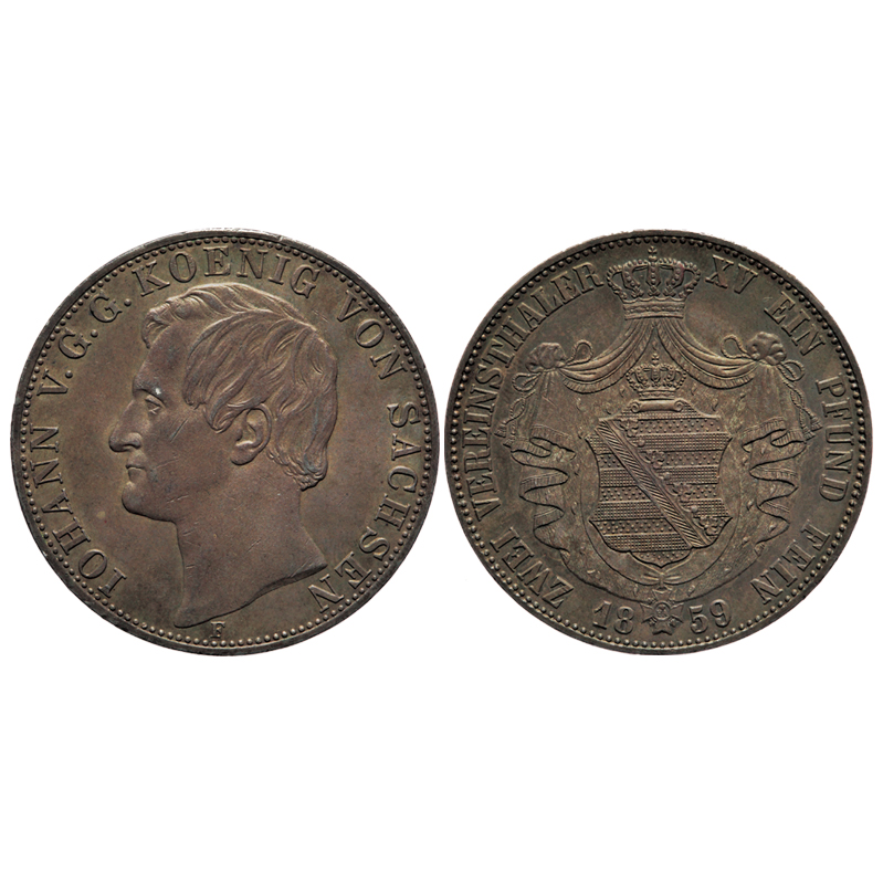 German States-Saxony, Silver 2 Thaler, 37.03gm, 1859 F, Obv: Bust of King Johann, Rev: Crest. KM 1195.