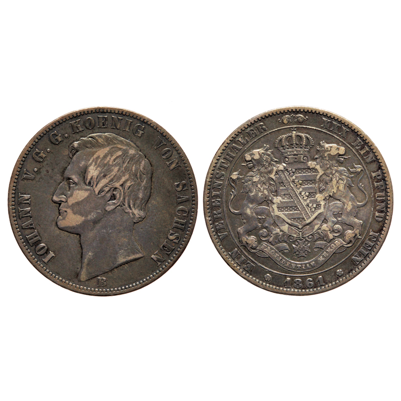 German States-Saxony, Silver Thaler, 18.20gm, 1861 B, Obv: Bust of King Johann, Rev: Crest. KM 1214.