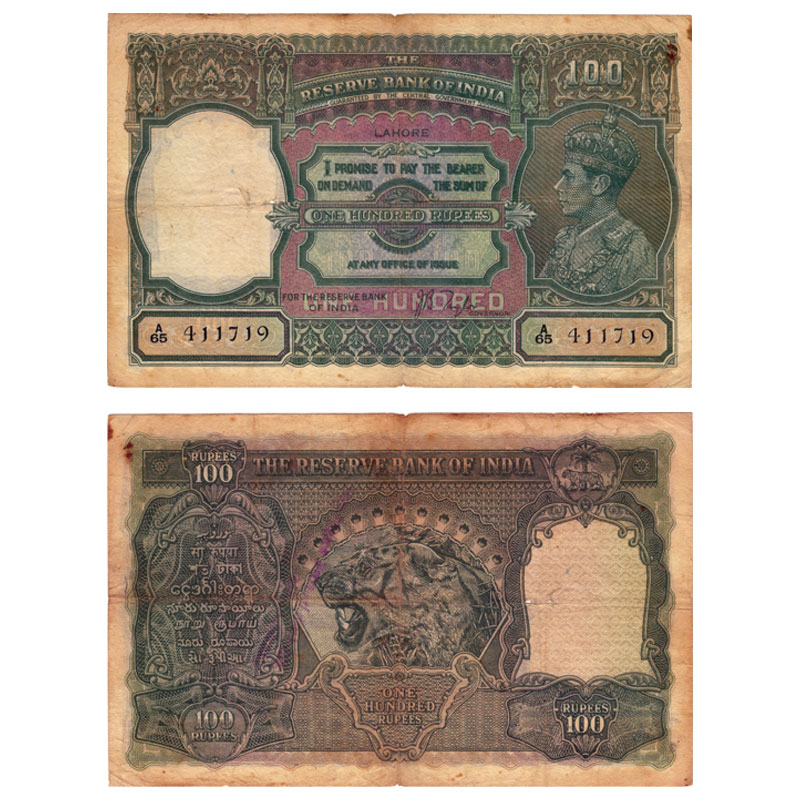 British India, George VI, 100 Rupees, Lahore circle, Watermark head facing right, Signed by J.B.Taylor, Serial no. A 65 / 411719. ( J & R 4.7.1E).
