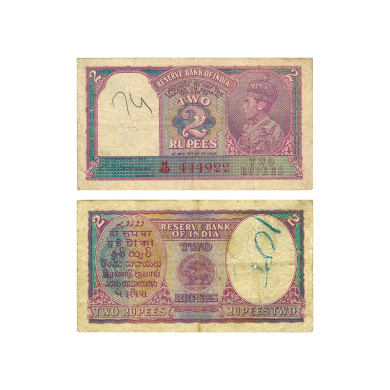British India, George VI, 2 Rupees, Watermark head facing right, Serial number in Black, Signed by J.B.Taylor, Serial no. A 3 / 747533. ( J & R 4.2.1).