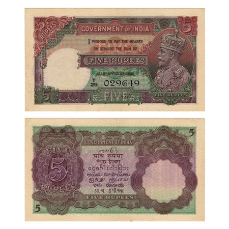 British India, George VI, 5 Rupees, Watermark Front facing head, Serial number in Black, Signed by C.D.Deshmukh, Serial no. C 33 / 158122. ( J & R 4.4.1).