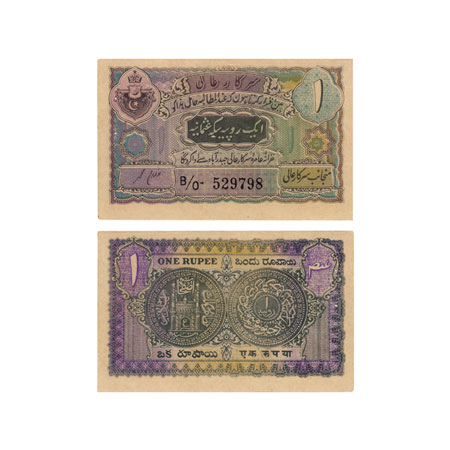 Hyderabad, 1 Rupee, Signed by Gulam Muhammad, Serial number B/0 529798, ( J & R 7.2.3).