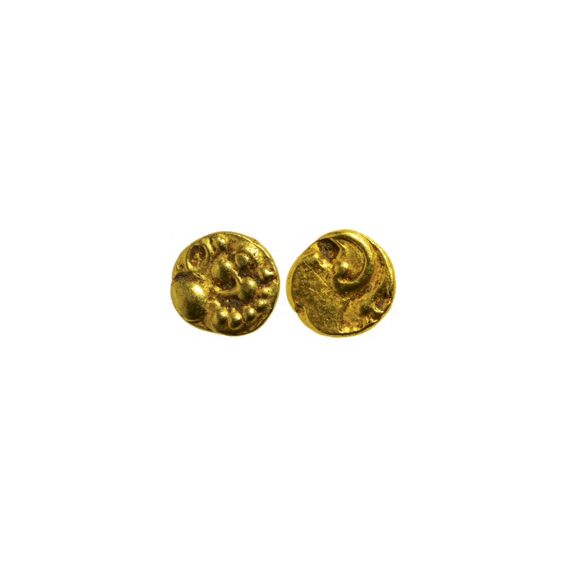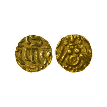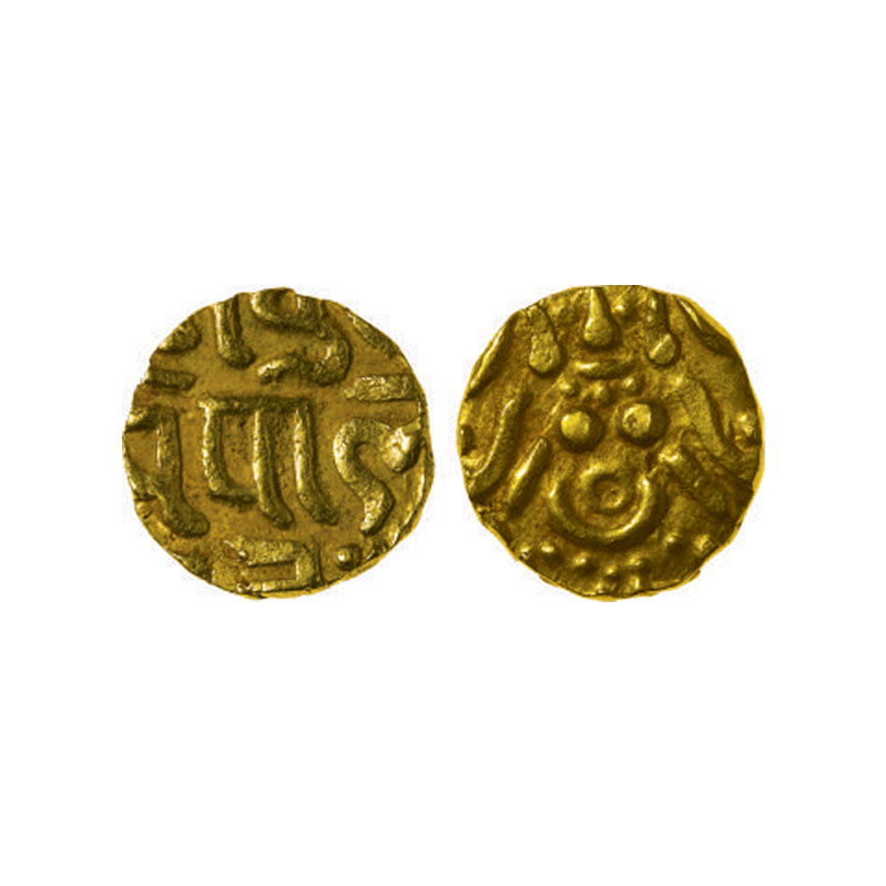 Shilaharas of Kolhapur, Gold 1/4 Pagoda or Double Fanam, 0.8gm, Obv: Decorative trident with sun and moon, Rev: globule. Mitch K&A 246.