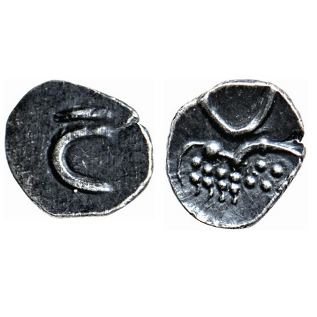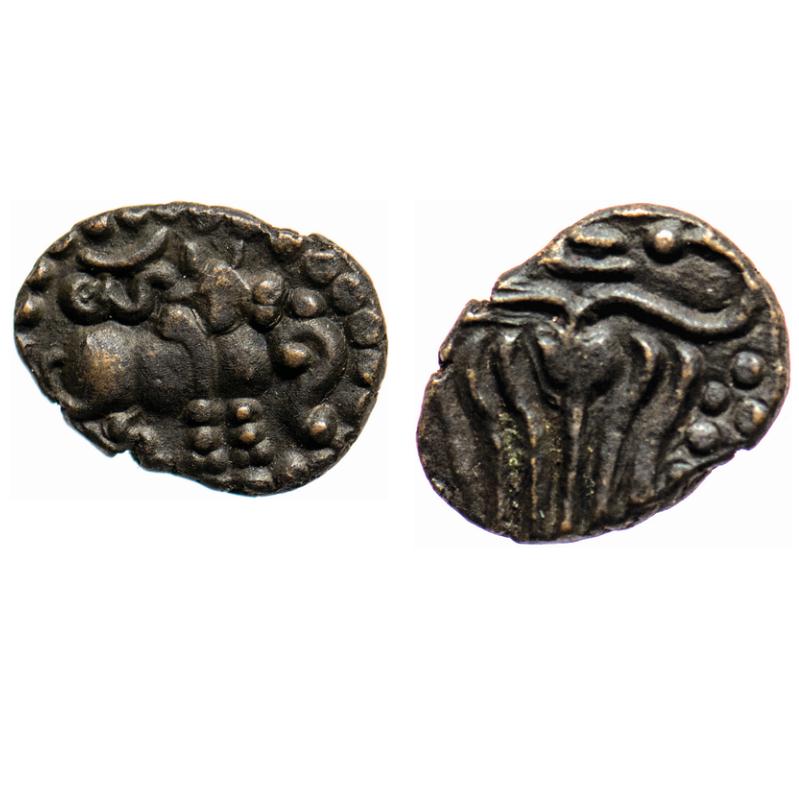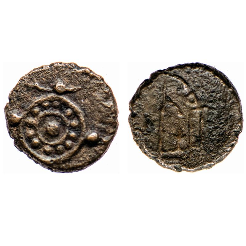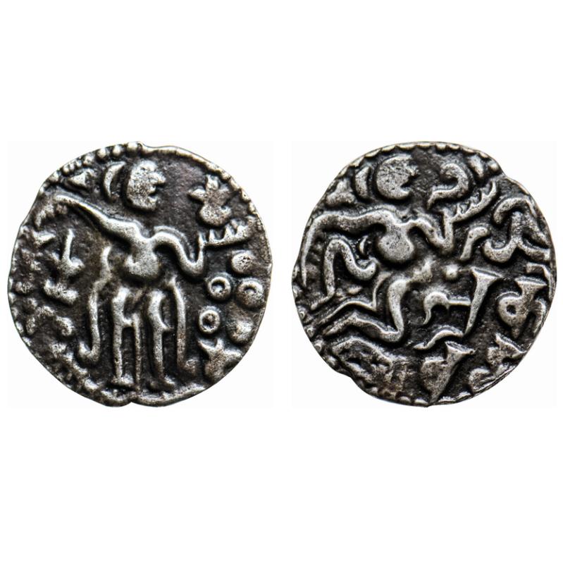 Hoysalas, Anonymous Issue, Silver Tara, 0.16gm, Obv: Crude depiction of animal in dotted circle, Rev: Kannada numeral 1 with stroke. Extremely Fine, Scarce.