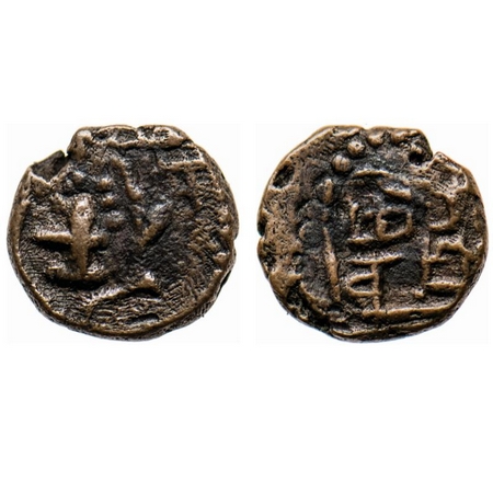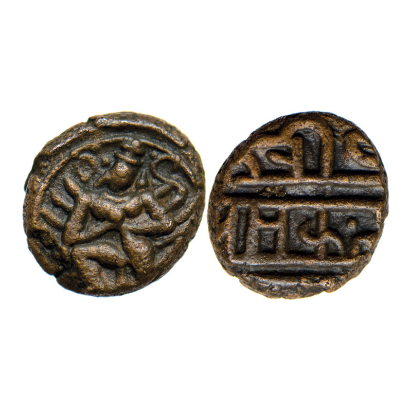 Vijayanagar, Hari Hara I (c. 1343-1356 AD), Copper Kasu, 3.26gm, Obv: Humped bull walking to right front of sankh, above ‘Ha’ in kannada, Rev: Chola type man standing facing to right. Mitch K&A 592. About Extremely Fine, Scarce.