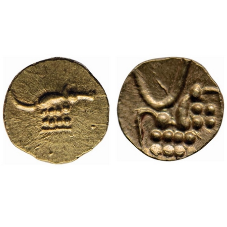 Hoysalas, Anonymous Issue, Gold Fanam, 0.38gm, Obv: Crude depiction of lion walking to right, Rev: Boar with elongated snout and curled up tail to right. K. Ganesh 8.18. Extremely Fine, Scarce.
