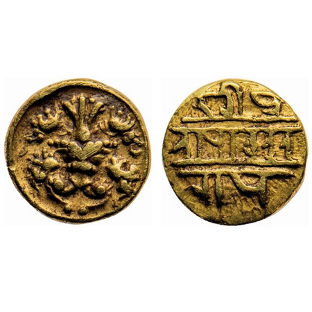 Yadavas of Devagiri, Rama Chandra Deva (c. 1270-1311 AD), Gold Padma Tanka, 3.79gm, Obv: Lotus in center, on top Nagari legend 'Sri Ram', conch on bottom and twice 'Sri' in kannada, Uniface. Mitch K&A # 289. Extremely Fine, Scarce.