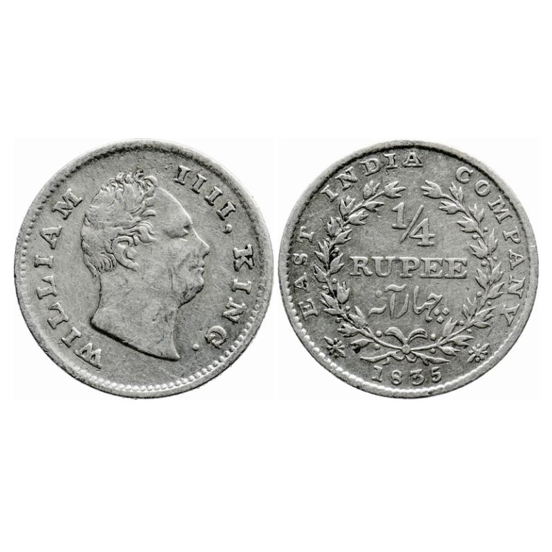 William IV, Silver, 1/4 Rupee, 1835, Bombay Mint, No initials, A/I, Reverse aligned. GK 65. Very Fine. Cleaned. Scarce.