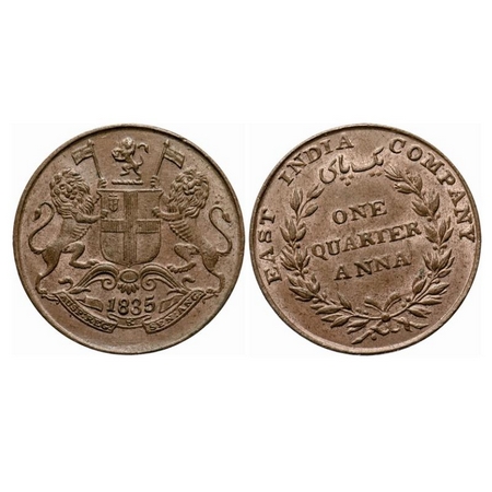 William IV, Copper, Quarter Anna, 1835, Bombay Mint, A/I(i), 18 Berries (9L + 9R), Numeral date 1835 double struck. GK 149. Uncirculated. Very Scarce.