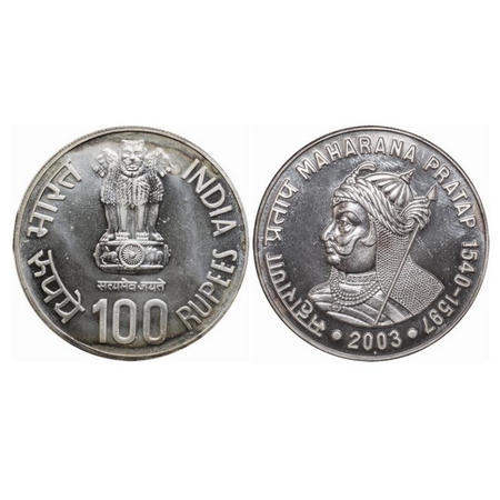 2003, Unc Coin, Half Silver, 34.86gm, 100 Rupees, Mumbai Mint, Maharana Pratap. Proof, Scarce.