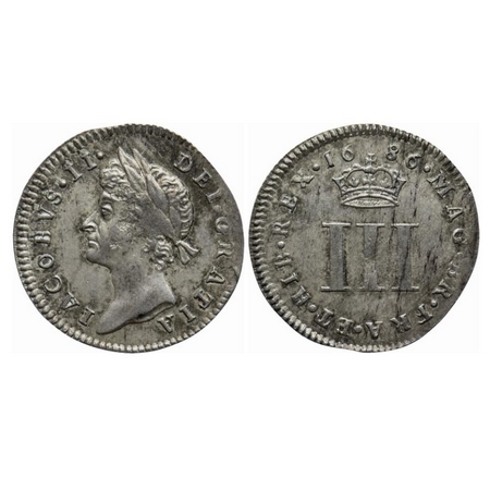 Great Britian, Silver, 3 Pence, 1.50gm, 1686, James II. KM 450. pg 827. Extremely Fine+, Rare.