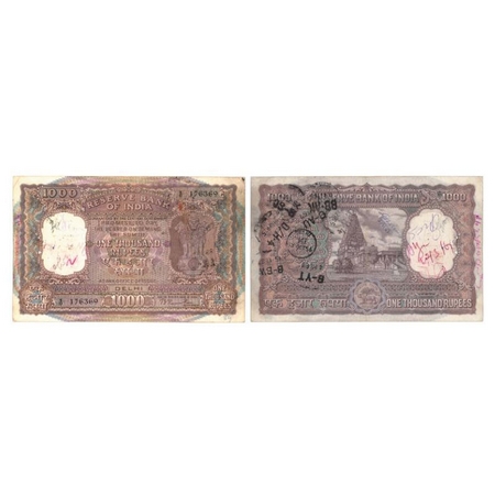 Republic of India, 1000 Rupees, Signed by B. Rama Rau, Serial No X0 176369, Delhi Circle. Pin holes, multiple post marks on reverse and pen writtings on obverse & reverse, folds. J&R 6.9.1.C. About Very Fine, Rare.