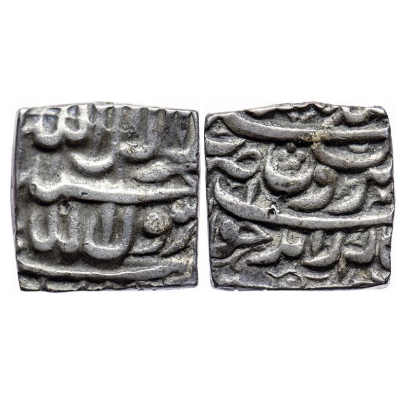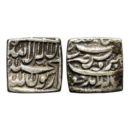 Akbar, Silver Square Rupee, 11.20gm, Bangla Mint, Kab-i-Roshan couplet, Kalima type. KM 86.1. About Extremely Fine, Scarce.