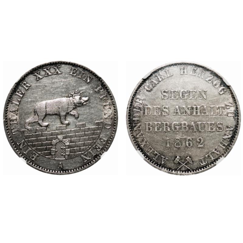 German States-Anhalt-Bernburg, Silver (0.750 silver) Thaler, 1862 (A). KM 88. NGC slabed AU Details, surface hairlines, Very Rare.