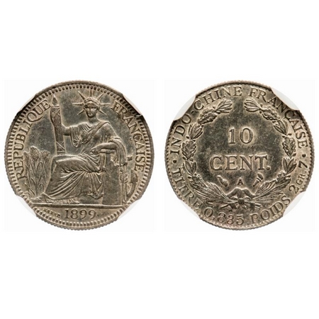 French Indo-China, Silver (0.835 silver) 10cents, 2.68g, 1899, 'A' Paris Mint, Obv: Republique Francaise, Rev: Indo Chine Francaise, TITRE 0.835 POIDS 2 GR.7. KM 9. NGS Slabed MS 61+ Choice, Scarce.