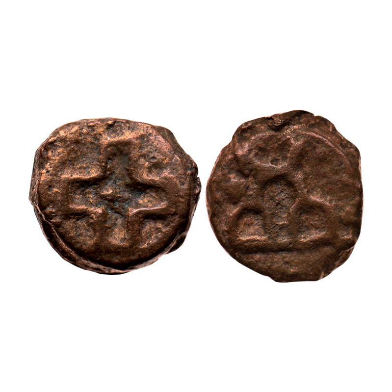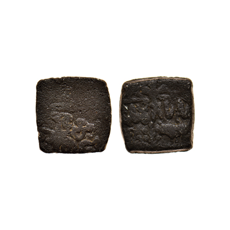 Ujjain Region (c. BC 200), Copper Unit (2), Obv: Mahakal standing on right front of spear and six armed symbol on left, Rev: twice frog and on second coin Obv: Mahakal standing on right front of spear and six armed symbol on left, Rev: twice swastik symbol. Bopearachchi & Pieper # Class 12 & 13.
