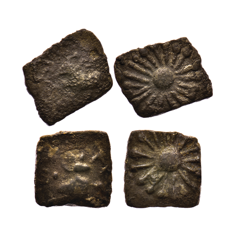 Punch Marked, Surashtra Janapada, Silver 1/4 Karshapana (2), Obv: Bold srivatsa symbol around circle and taurine. Uniface. Rajgor # Series 18…..