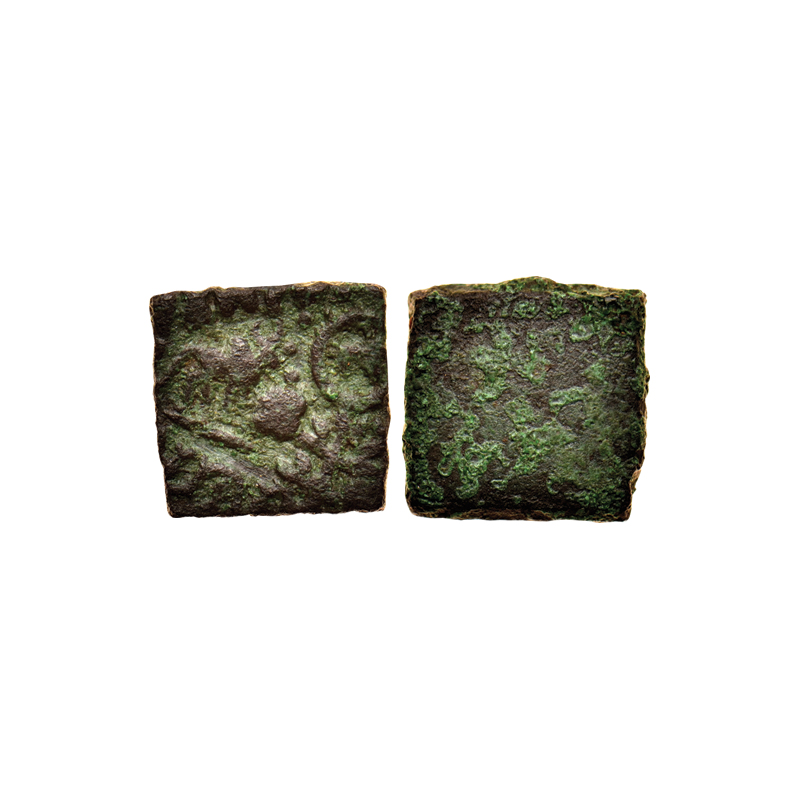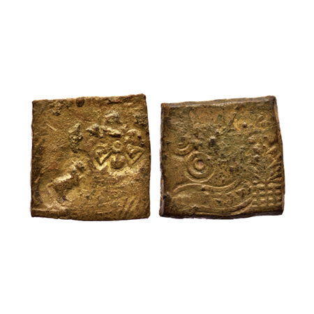 Punch Marked, Eran-Vidisha Region, Bronze Unit (2), Obv: Tree in railing, flower, river with fishes and four orb ujjaini symbol and swastik on each orb on first and, tree in railing, four circle join to each other with crescent and river with fishes,Uniface.