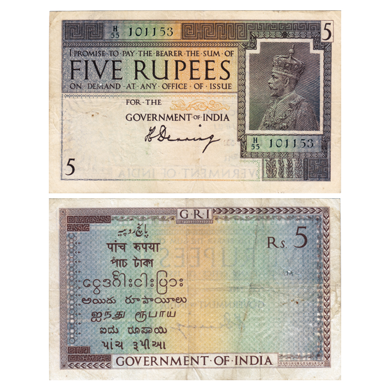 British India, George VI, 5 Rupees, ND (19437). Signed by C.D. Deshmukh, Serial No D55 109203 in red. J&R 4.4.2.
